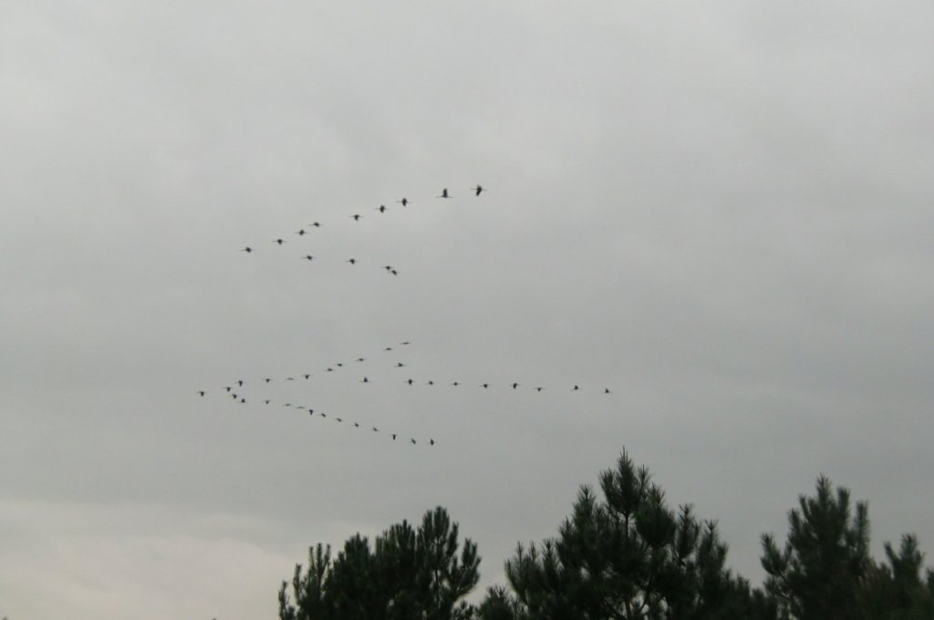 In großen Formationen ziehen sie über uns hinweg, um etwa 800 Meter von uns entfernt auf ihrem Schlafplatz zu landen. Mit bloßem Auge sind sie vom Beobachtungsturm aus nicht zu erkennen, mit dem Fernglas kann man sie sehen, wenn man weiß, dass sie dort sind. Unsere Kameras können sie natürlich auch nicht erfassen.