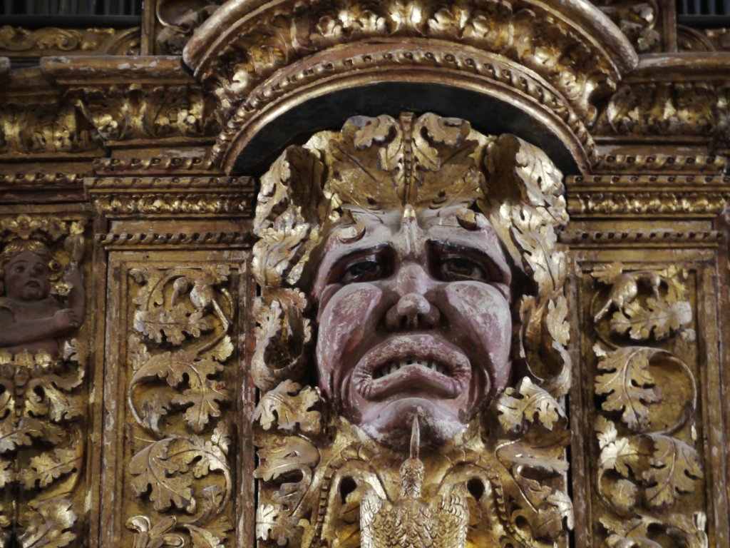 Die Fratze auf der Orgel soll gemeinsam mit der Macht des kraftvollen Orgelklanges Böses abwehren, erfahren wir zu unserer zweiten Frage.