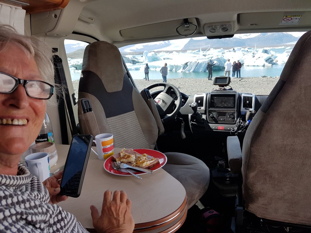 Wahrscheinlich haben wir noch nie an einem derart außergewöhnlichen Ort „Strammen Max“ gegessen. Während in der Pfanne die Spiegeleier brutzeln, schwimmen draußen die Eisberge vorbei.