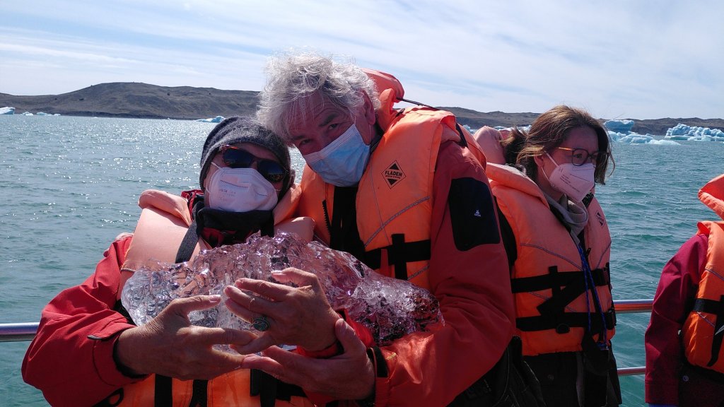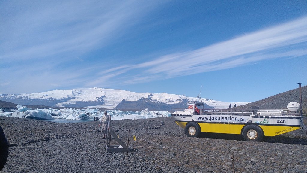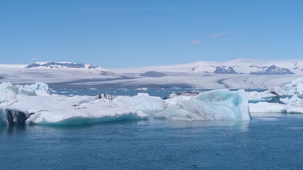 Wir sind an einem der schönsten Naturwunder Islands, dem Jökulsárlón. Der Gletscher kalbt, sprich kleine und große Eisblöcke brechen von ihm ab und plumpsen in den See. Dort treiben sie herum, bis sie schmelzen. Malerisch liegen sie ganz in der Nähe vom Parkplatz herum und locken die Menschen zu Hauf an. Dieses Jahr, noch im Zeichen der Pandemie, hält sich die Zahl der Zuschauenden allerdings in Grenzen.