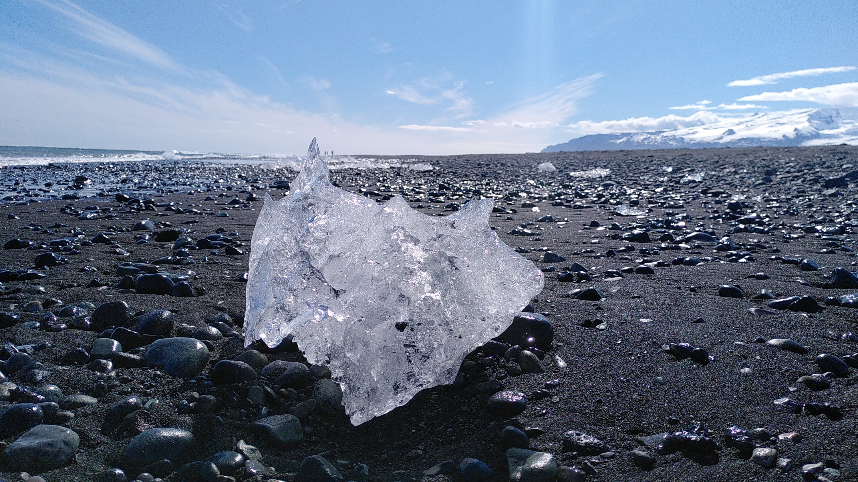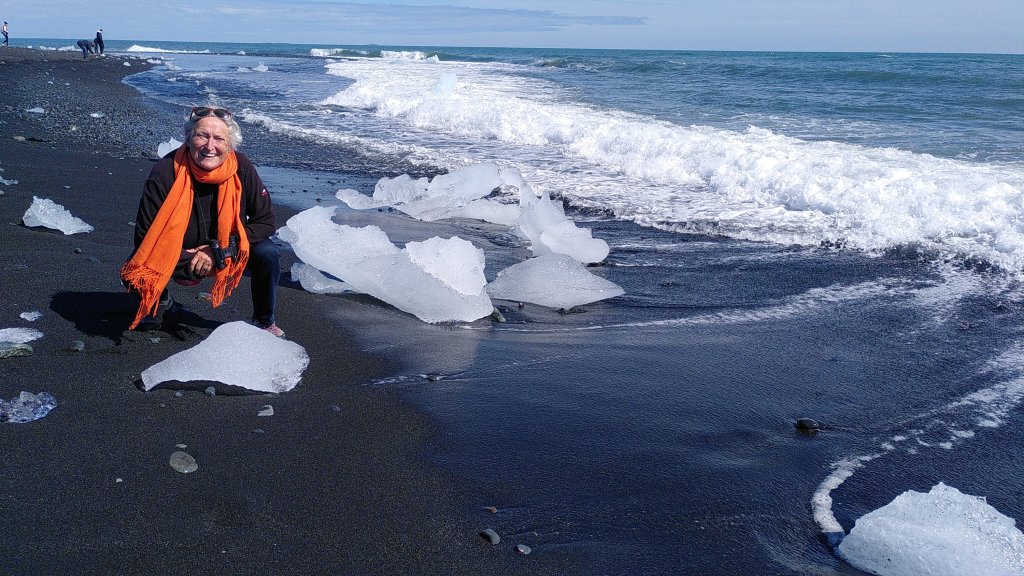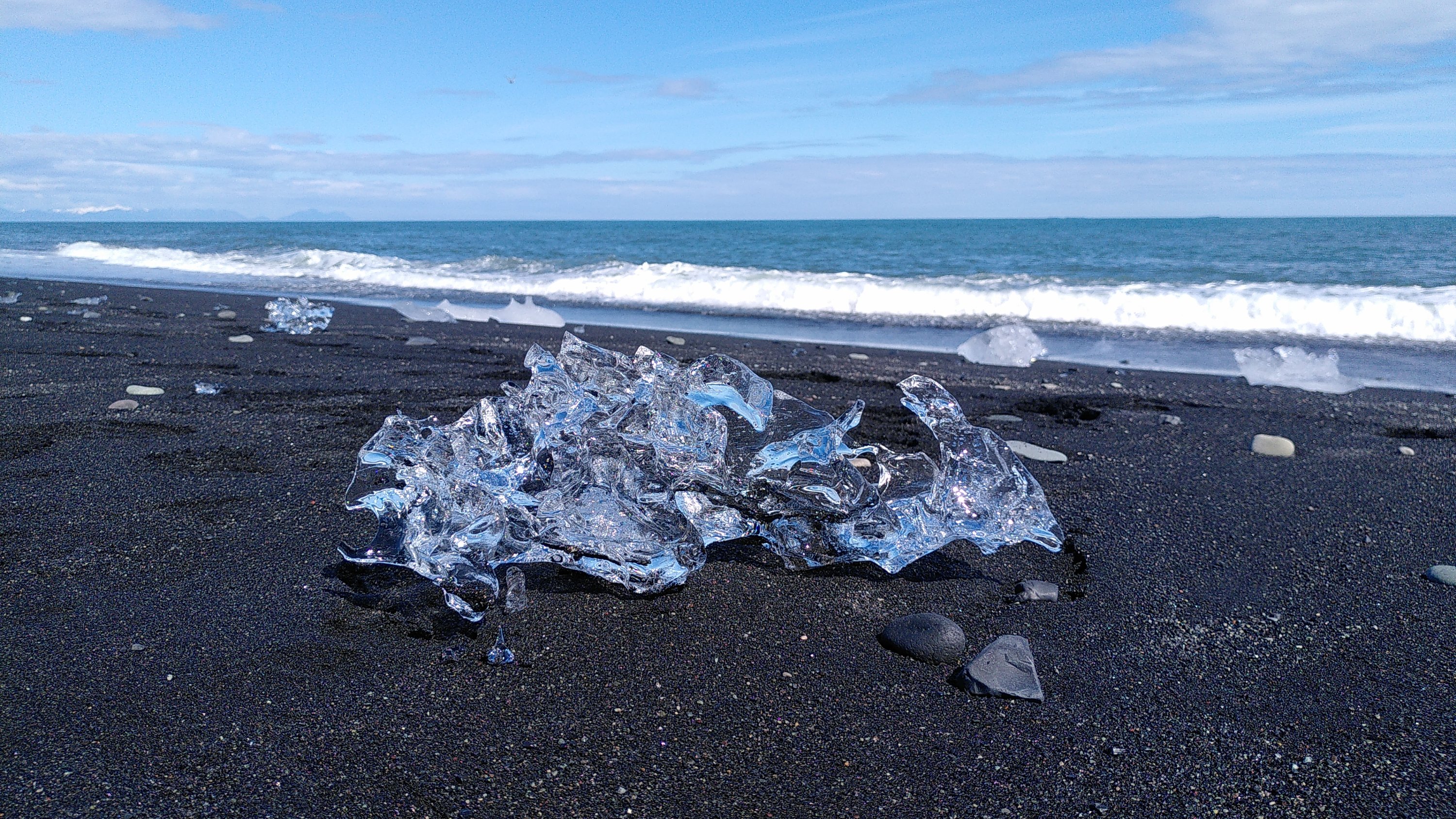 Später am Nachmittag wechseln wir hinüber auf die andere Straßenseite und fotografieren am Diamantenstrand weiter. Kleine Eisbrocken werden aus der Lagune ins Meer getrieben und teilweise zurück an den – hier schwarzen – Strand getrieben. Dort funkeln sie in der Sonne wie Diamanten.