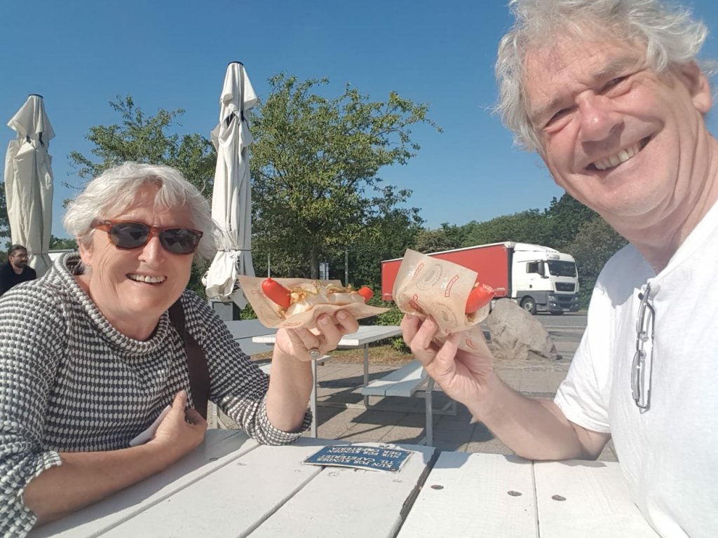 Willkommen in Dänemark! Trotz der Pandemie verläuft der Grenzübertritt völlig problemos. Der junge Grenzbeamte sieht sich unser Testergebnis im Handy an und winkt uns weiter. Die erste Raststätte mit dänischen Hotdogs ist unsere. Schließlich haben wir noch nicht gefrühstückt.