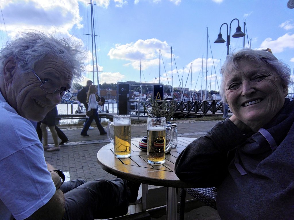 Wir suchen uns einen Übernachtungsplatz beim Flensburger Yachthafen und gehen erstmal auf ein Bier in eine der zahlreichen Kneipen dort. Seeluft schnuppern und Boote gucken beruhigen. In Flensburg gibt es einen großen Fiathändler, bei dem wir morgen Früh um Hilfe bitten werden. Auf unserem Parkplatz werden kostenlose Coronatests angeboten. Wir buchen zwei für 8.30 Uhr am nächsten Morgen, denn wir brauchen einen Nachweis, dass wir kein Corona haben, für den Grenzübertritt. So ist alles erledigt und wir lassen uns die Fish and Chips beim Gosch zum Abendessen schmecken.