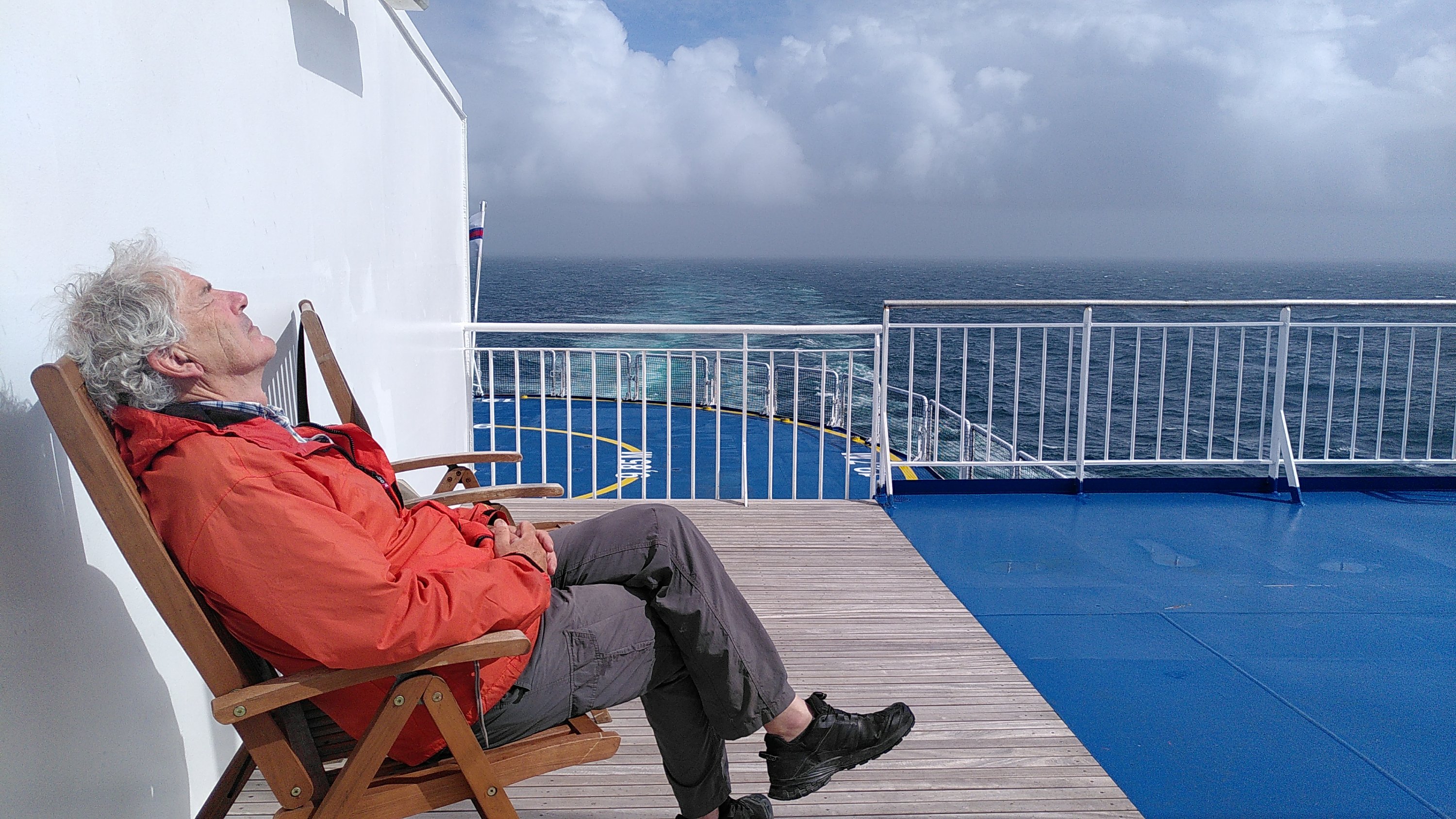 Wir bleiben von Dienstagvormittag, elf Uhr bis Donnerstagmorgen, 8 Uhr auf der Fähre und richten uns in ein entspanntes Treiben ein: mal hier sitzen, mal dort sitzen, mal an Deck gehen (meist nur kurz, weil zu kalt), aufs Wasser gucken, sich über ein paar Basstölpel freuen, essen gehen, ein Bierchen trinken, lesen, spielen. Das Meer ist freundlich zu uns, prophylaktisch eingenommene Reisetabletten tragen auch zum Wohlbefinden bei.