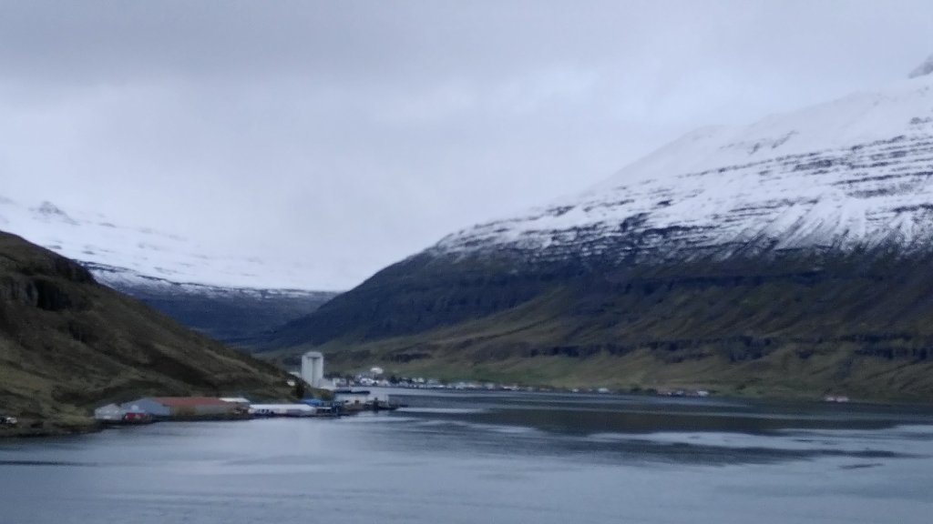 Die zweite Nacht an Bord ist ziemlich ruppig. Das Schiff wird von den Wellen recht gebeutelt. Gegen 7 Uhr erhaschen wir einen ersten Blick auf Island: schneebedeckte Berge säumen den Fjord von Seydisfjördur, wo wir um halb neun anlegen.