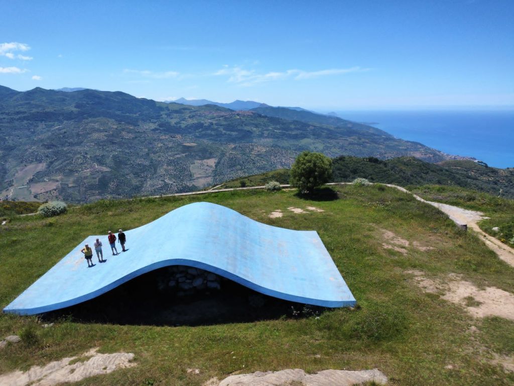 Eine vom Wind aufgebauschte blaue Welle bringt die Kraft des Mittelmeeres hoch hinauf in die Berge. Energia Mediterranea wurde 1989 von Antonio di Palma geschaffen und liegt oberhalb des Bergdorfes Motta.