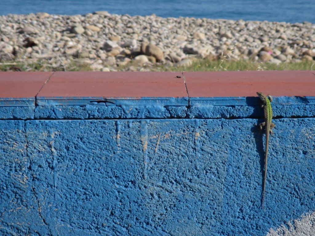 Eine Eidechse sonnt sich vor unserem Bus, während wir frühstücken. Richtung Stromboli fährt ein Kutter. Das Meer ist  hellblau flach. Heute werden wir in Messina die Fähre aufs Festland nehmen und das frühlingsschöne Sizilien nach fast drei Wochen wieder verlassen. Langsam geht es jetzt Richtung Heimat.