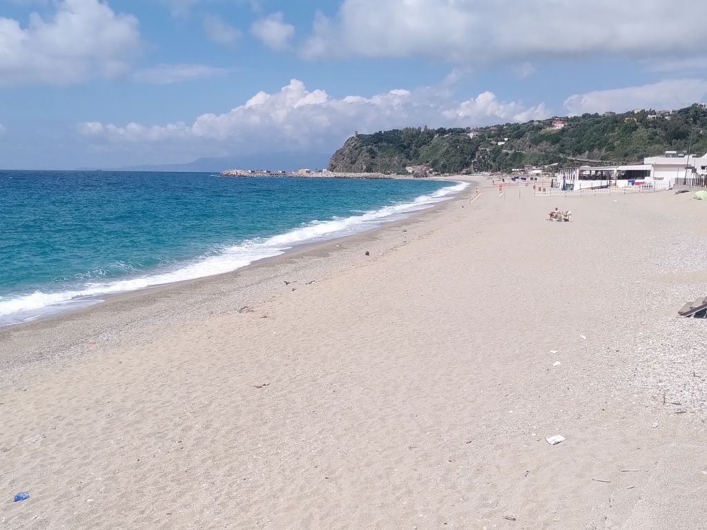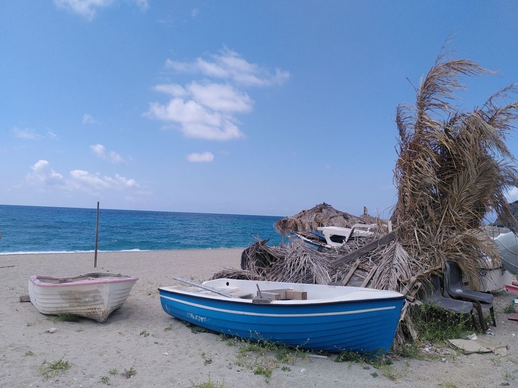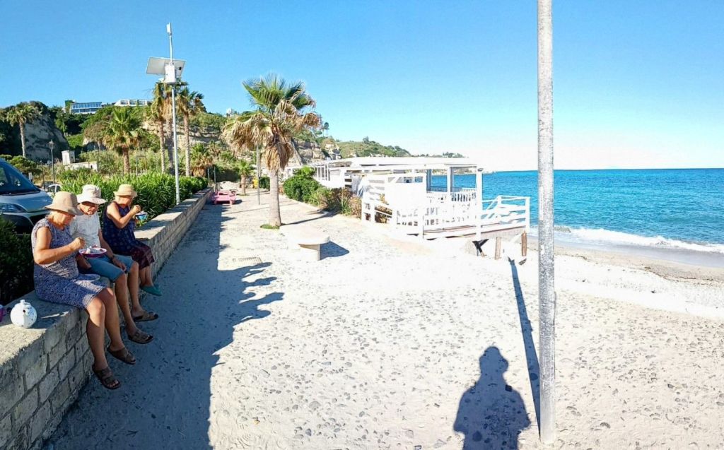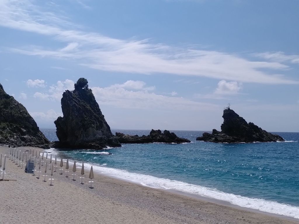 Die restlichen 500 verteilen sich entspannt auf 15 Kilometern und dann sind wir wieder am Meer, in Palmi, das für seinen schönen Strand so gelobt wird. Während wir in Sizilien, etwa in Cefalu, das Gefühl hatten, die Hauptsaison habe begonnen, ist hier alles noch zugeklappt. Die meisten Bars und Restaurants sind geschlossen, ganze vier Menschen sind am Strand. In der ersten Bar am Strand gibt es keinen Strom und somit auch keinen Kaffee, aber die hinterste Bar hat auf. Und Kaffee.