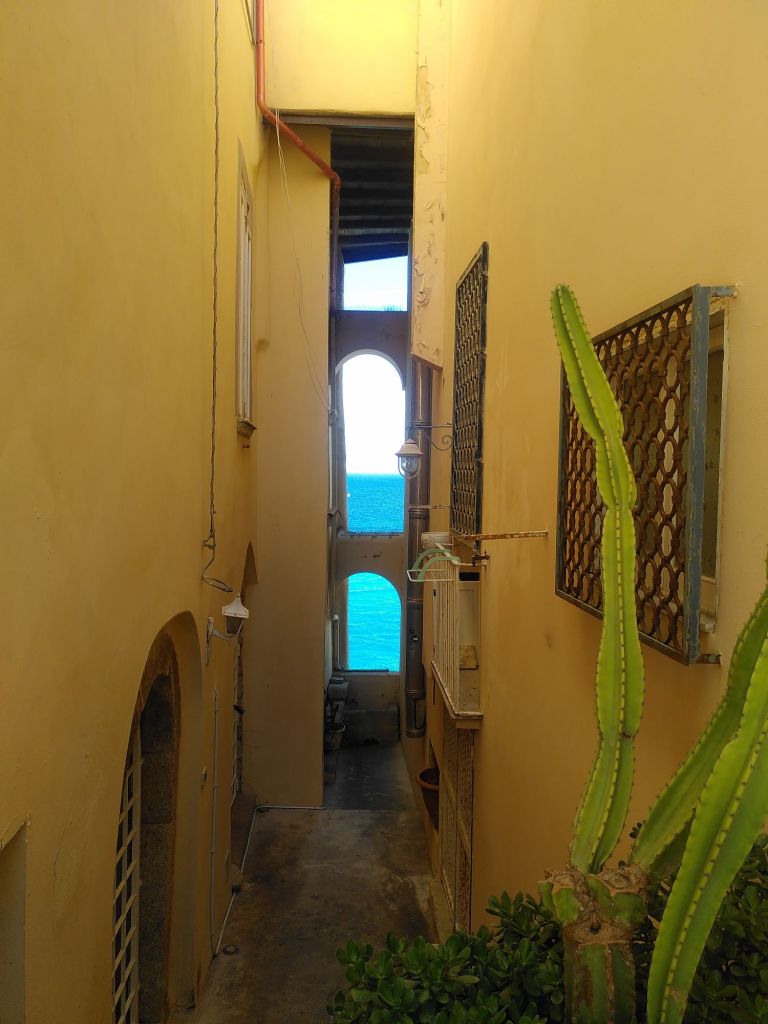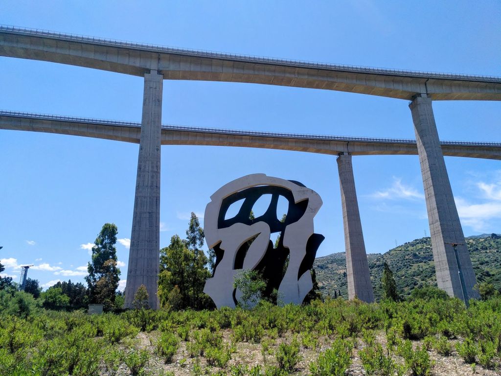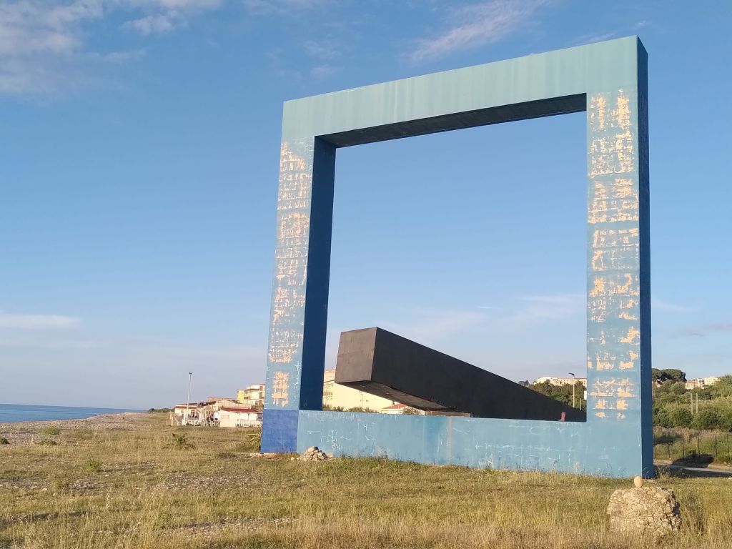 Unser letztes Kunstwerk für heute steht unten am Meer: Monumento ad un poeta morto. Der Maler Tano Festa entwarf eine Skizze des Denkmals, das seinem Bruder Francesco Lo Savio gewidmet ist, und Presti beschloss, es in monumentalen Ausmaßen an der Strandpromenade in Margi zu errichten. Das Denkmal wurde von der Bevölkerung in Fenster zum Meer“ umbenannt und 1989 eingeweiht.