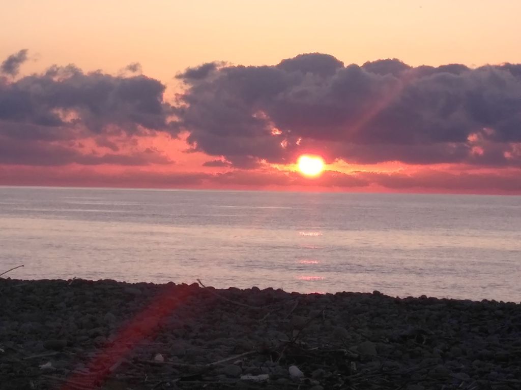 Wir sind jetzt müde, es ist inzwischen acht Uhr geworden, die Fahrt war anstrengend, die Eindrücke intensiv. Gleich in der Nähe finden wir ein Plätzchen am Meer. Der Sonnenuntergang lässt nicht lange auf sich warten.