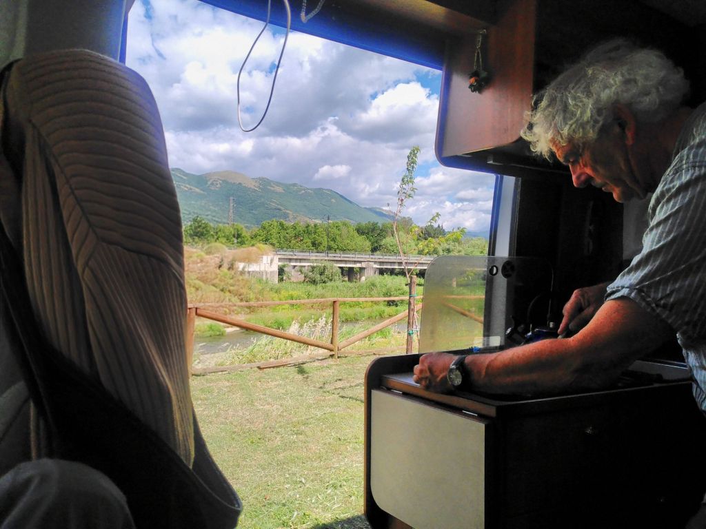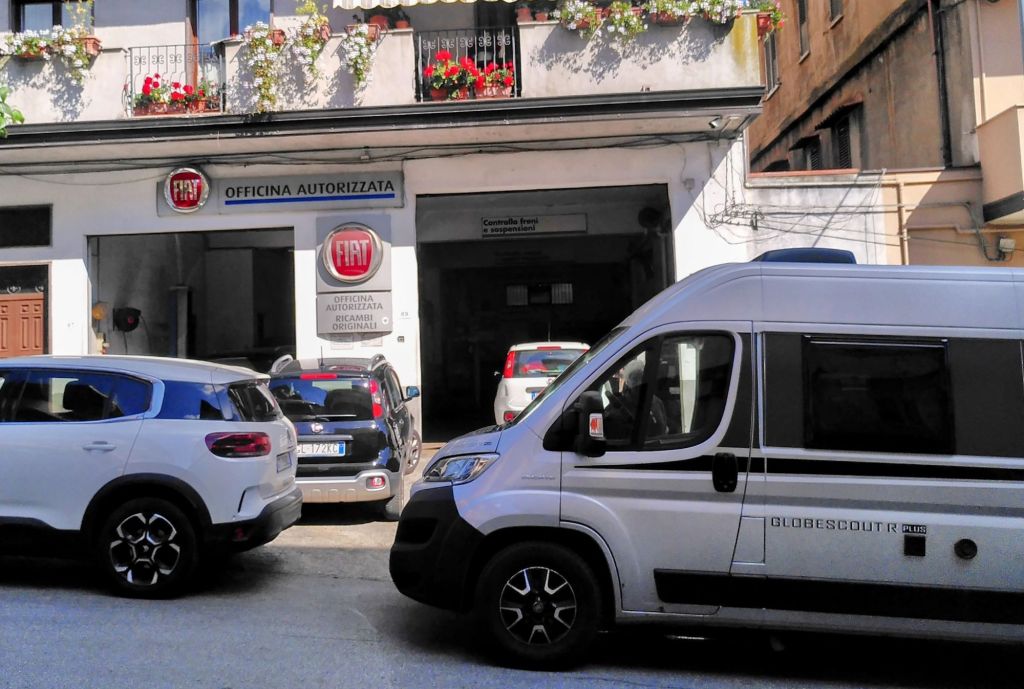 Am Nachmittag kümmern wir uns um unser rollendes Zuhause, das nachdrücklich, rot blinkend, einen Ölwechsel erbittet, erzwingt  eigentlich. Also gut, wir sind ja nicht so, die nächste passende Werkstatt liegt fast auf dem Weg, die Leute sind nett und kompetent und in einer Stunde ist alles erledigt. Mille grazie!
