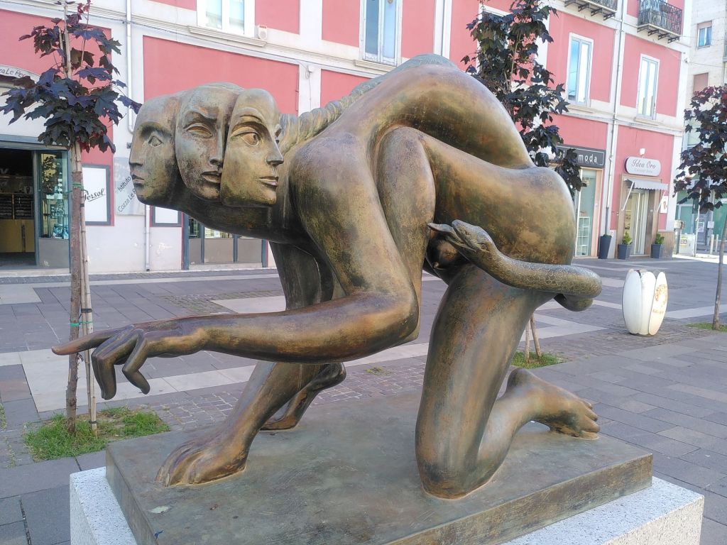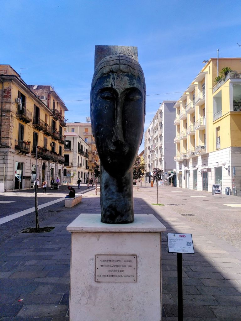 Unser heutiges Tagesziel ist die Stadt Cosenza, etwa 80 Kilometer nördlich von hier im Landesinneren gelegen. Hier gibt es wieder viel Kunst im öffentlichen Raum. Die aus Cosenza stammende Familie Bilotti hat der Stadt ihre Sammlung von Werken internationaler Künstler geschenkt, die in der Fußgängerzone, dem Corso Mazzini, aufgestellt wurden.