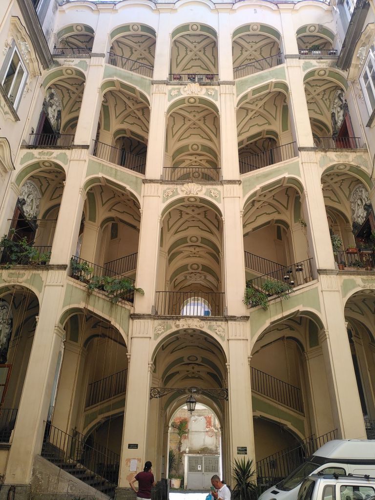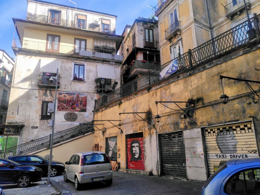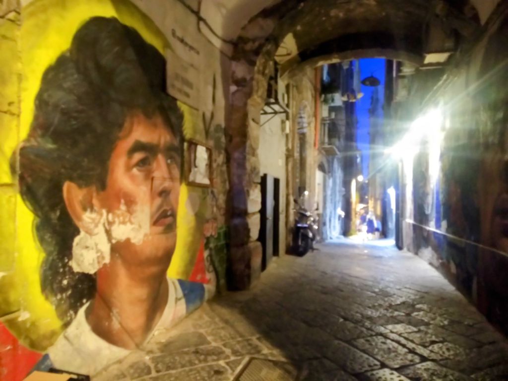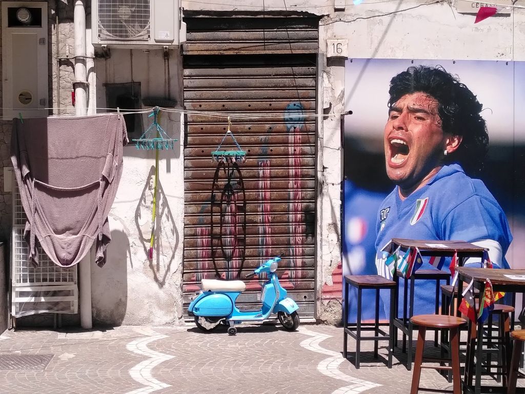 Wir haben es nicht weit bis zum Viertel Sanità, das voller Gässchen, Kirchen, Kapellen, Palazzi, Cafés und viel Maradona-Verehrung ist. Der SSC Neapel ist gerade italienischer Meister geworden. Auch das muss gefeiert werden. Mit vielen Fähnchen und Bildern. Hier sind die Einheimischen unterwegs, kaum Touristen.