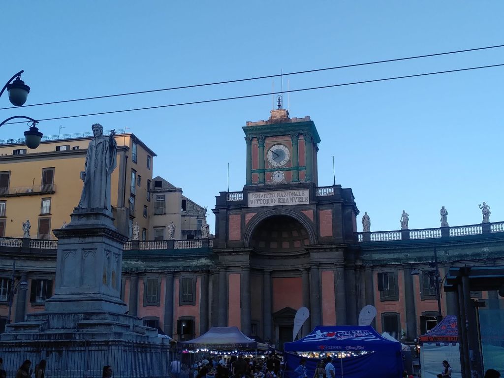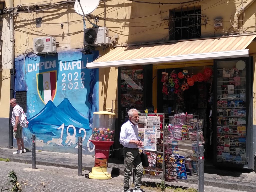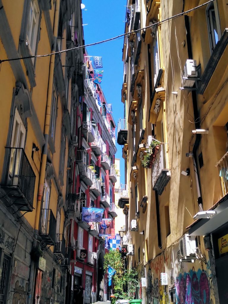An der Piazza Dante steigen wir aus. Dort beginnt das Centro storico, die Altstadt. Ein Menschenauflauf ohne gleichen schiebt sich durch die Gassen. Eine Bar neben der nächsten Pizzeria. Beim Aperitif müssen wir die Füße einziehen, damit sie nicht unter den Roller kommen. Damit wir uns wie zuhause fühlen, zieht immer mal wieder ein Flugzeug über unsere Köpfe. Fast jede Hauswand ist beklebt oder bemalt.
