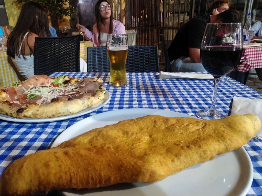 Was das Abendessen angeht betätige ich mich einmal mehr als Forschungsreisende: im Reiseführer stand, dass die frittierte Pizza eine Spezialität der neapolitanischen Küche sei. Dann muss ich sie natürlich probieren – obwohl mir klar war, dass das nichts wűrde. Zu viel, zu fett, aber immerhin gute leckere Füllung. Was tut man nicht alles für die Forschung.