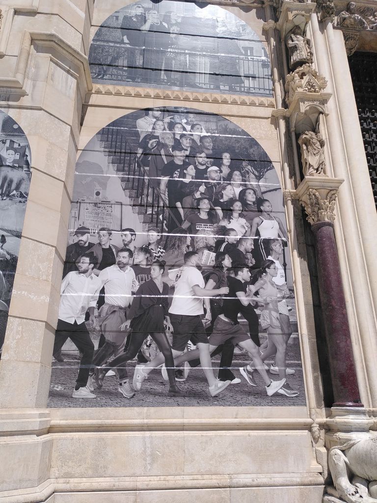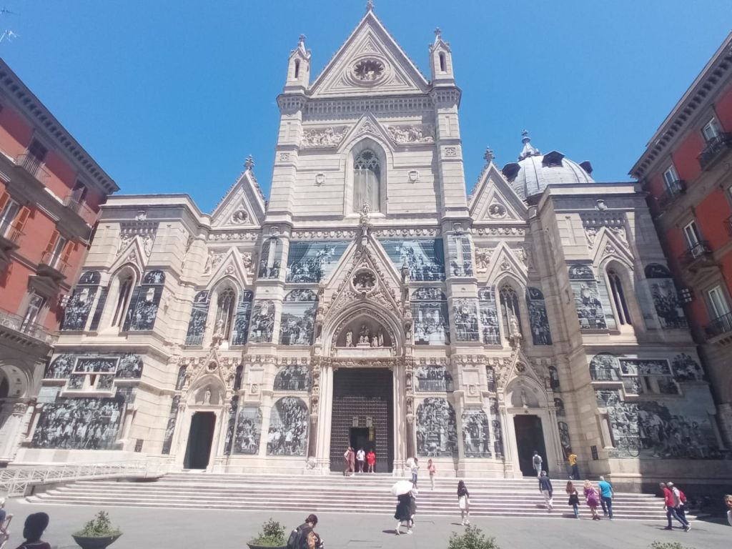 Was für eine Überraschung ist die Fassade! Was ist denn da aufgeklebt? Eine Informationstafel klärt auf: der französische Künstler JR hat gemeinsam mit Menschen aus verschiedenen neapolitanischen Vierteln 606 Menschen auf ein eigens für den Dom gestaltetes mural appliziert.