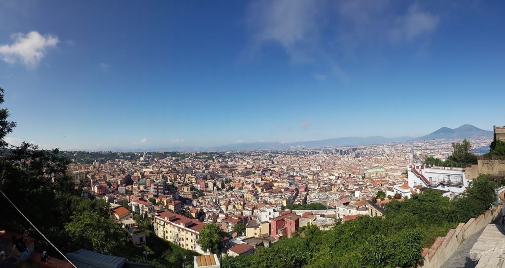 Wie in einigen anderen Ländern Europas, außer Deutschland, sind die öffentlichen Verkehrsmittel hier günstig: Wir zahlen für ein Tagesticket 5,50 Euro. Da wir müde gelaufen sind, fahren wir für den Rest des Tages lieber. Zuerst mit der Standseilbahn hinauf zum Castel Sant‘ Elmo. Von hier oben hat man eine fantastische Aussicht auf die Stadt und den Vesuv.