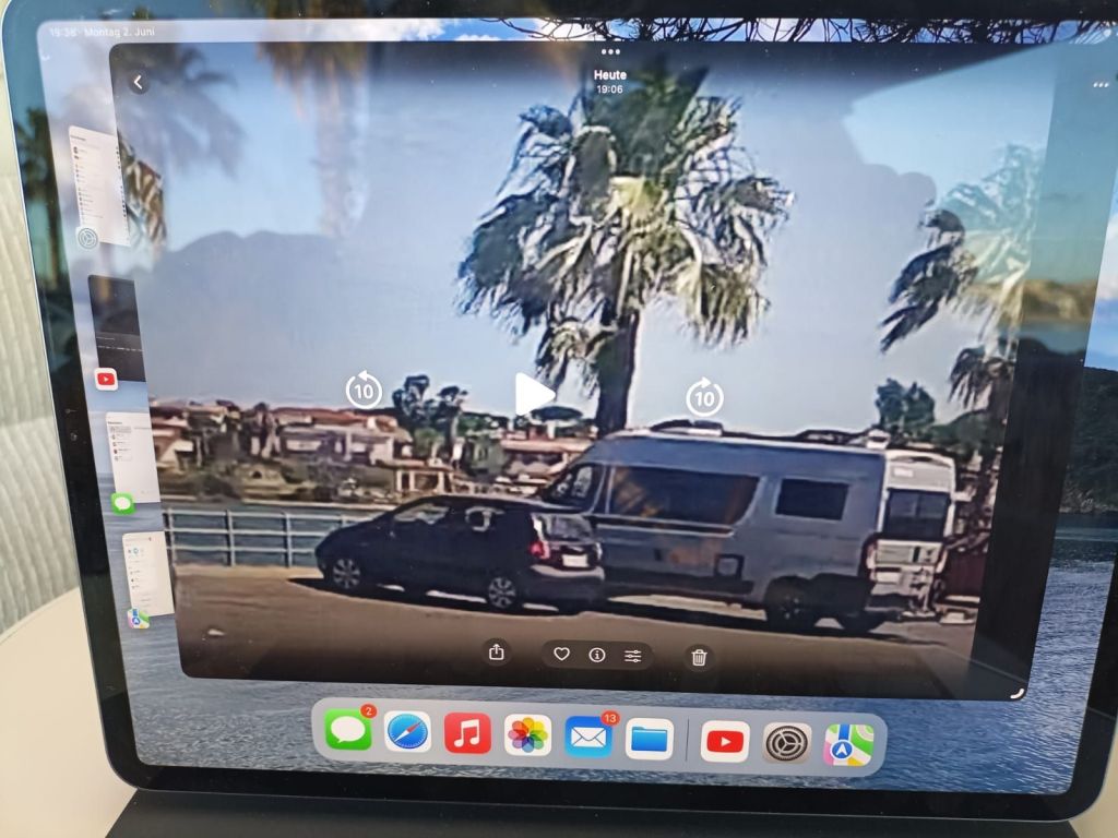 Gegen Sechs radeln wir zurück zum Bus und sind gespannt, ob die Camper, denen wir vorhin den Tipp mit unserem Parkplatz gegeben haben, sich zu uns gesellt haben. Haben sie. Sie stehen direkt neben uns. Ich gehe rüber zum Hallo-Sagen und werde recht aufgeregt begrüßt. Um eine lange Geschichte kurz zu machen: Die Beiden hatten sich gerade neben uns gestellt, als sie sich wundern, dass jemand in unserem Bus auf dem Fahrersitz sitzt. Seltsam. Ob wir zu Dritt unterwegs sind, überlegen sie. Petra ist das nicht geheuer. Auf unserer anderen Seite steht ein schwarzer PKW dicht an uns dran, sieht sie, als sie um unseren Camper rumgeht. Sie steigt sogar aufs Mäuerchen und schaut in unseren Bus. Niemand zu sehen.