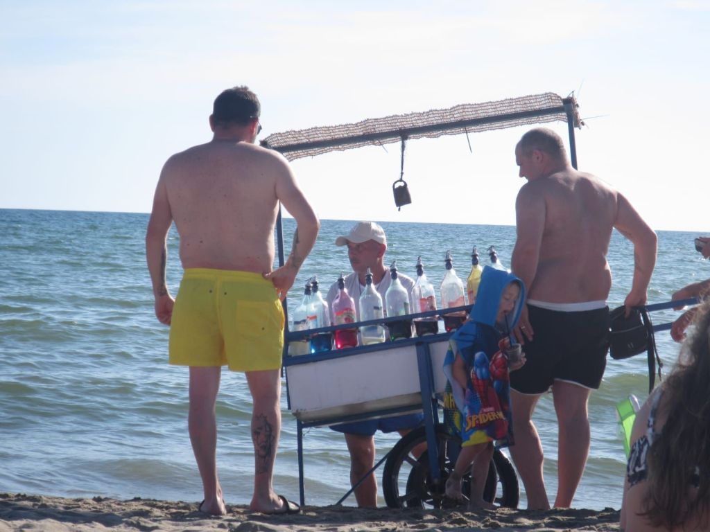 Dann eben nicht, fahren wir halt an den Strand. Zwischen all den Lidos mit Liegestühlen, Sonnenschirmen und lauter Musik gibt es ein knapp fußballfeld großes Fleckchen mit einem spiaggia libera, einem kostenlosen Fleckchen zum Sonnen und Schwimmen. Mit uns sind ein paar Familien und einige Pärchen dort. Ein Fischer bietet seine Meeresfrüchte zum Kauf an. Mit einer Trillerpfeife kündigt sich der Eismann an und ist schnell von großen und kleinen Schleckermäulern umringt. Das Wasser ist warm genug, dass wir beide (!) schwimmen gehen.
