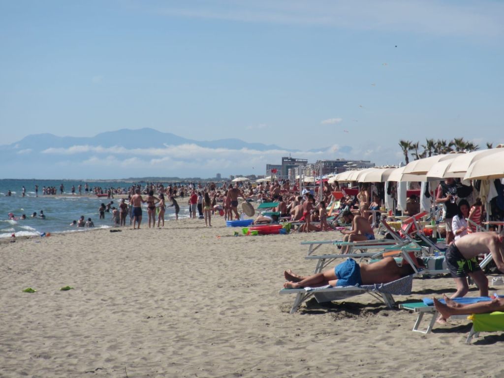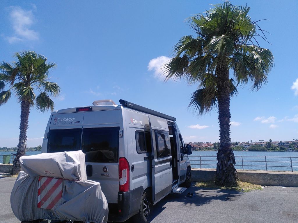 Wir steuern den ersten Campingplatz an. Den gibt es nicht mehr. Kommen an einem Schild vorbei, bremsen, biegen ab: „Wir haben nur noch Bungalows und akzeptieren keine Camper mehr“.  Weder bei Maps noch bei Park4Night sind hier in der Gegend Stell- oder Campingplätze verzeichnet. Nur ein Lido, also ein bewirtschafteter Strandabschnitt neben dem anderen, zu denen die Roller und PKW aus dem Großraum Neapel heute am Feiertag strömen.