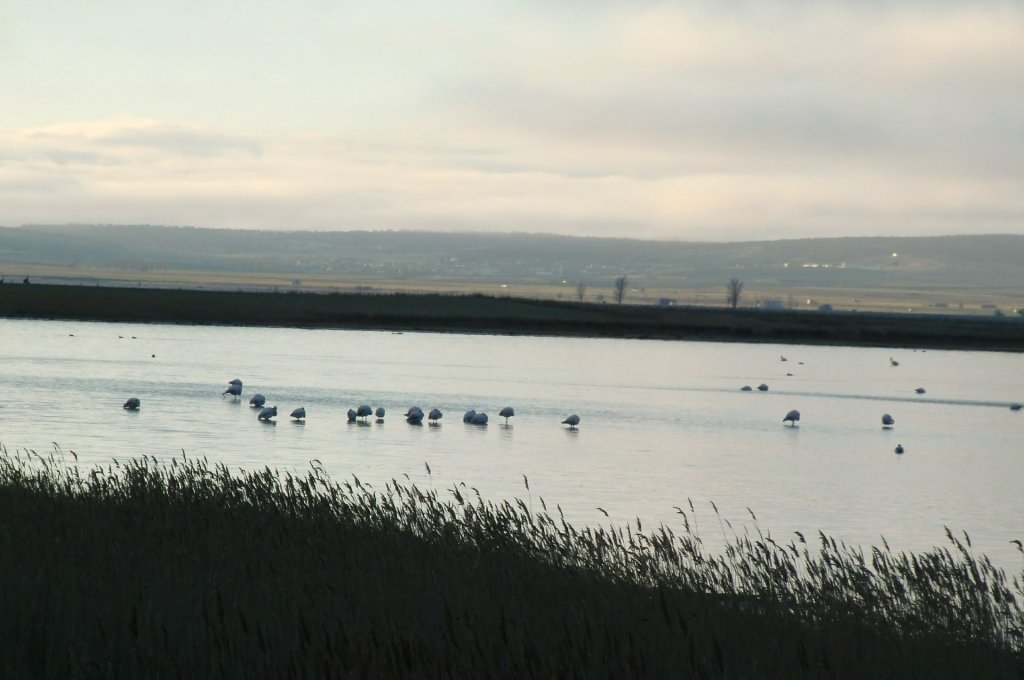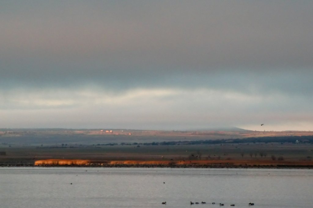 Noch vor Sonnenaufgang schlüpfe ich in Leggings, Jeans, zwei Pullis, Winterjacke, Mütze und Handschuh, schnappe mir Kamera und Fernglas und verlasse leise den Bus. Ich habe den Eindruck, alles schläft noch, außer mir, ein paar Flamingos und den Kranichen. Die trompeten schon eifrig in den kalten Februarmorgen hinein, fliegen kurz mal auf, schütteln ihr Gefieder, lassen sich dann aber wieder nieder. Auch als bald darauf die Sonne aufgeht, werden sie nicht lebhafter. Vielleicht ist ihnen noch zu kalt.