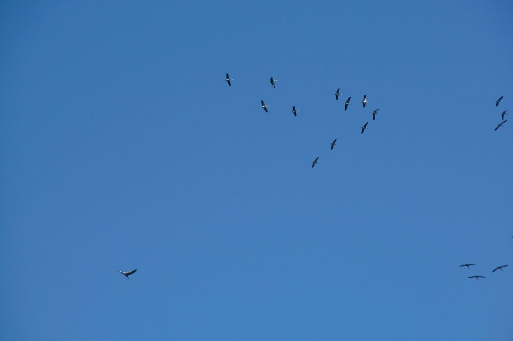 Im Bus ist es gerade so richtig gemütlich, wir klönen virtuell mit fernen Freunden, der Kaffee und das spanische Nussbrot mit Eichsfelder Mettwurst aus Achims Heimat sind lecker, das tägliche Wordle ist gelöst, als das Vogeltrompeten draußen immer lauter und lauter wird. Wir öffnen unsere Tür, blicken zum Himmel und erleben ein Kranichspektakel vom Allerfeinsten. Aus allen Richtungen fliegen sie herbei, bilden Formationen, trennen sich wieder, kommen zu neuen Gruppen zusammen. Und das begleitet von dem für sie typischen lauten Tröten. Tausende von Vögeln fliegen um uns herum, wir kommen mit dem Schauen fast nicht nach. Umzingelt von Kranichen, endlich mal zur richtigen Zeit am richtigen Ort.