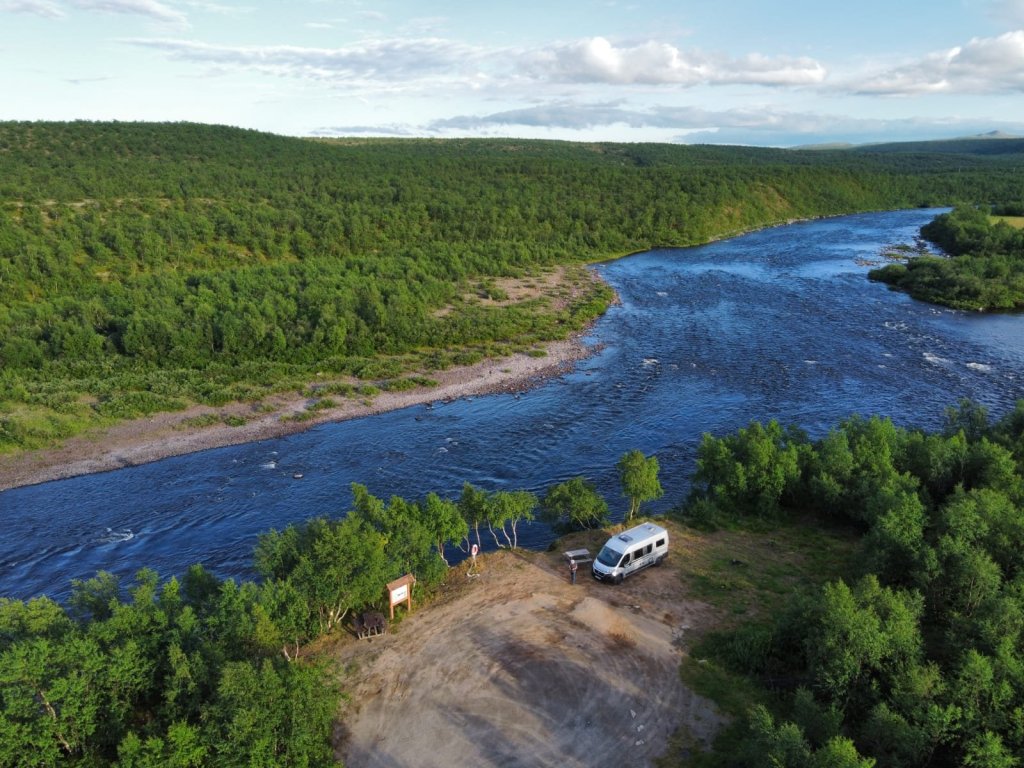 Der nächste Tag führt uns wieder durch Birkenwälder, an Seen und Flüssen entlang, wir besuchen wie gesagt Karasjok und Kautokeino, am Abend finden wir ein lauschiges Plätzchen an einem Fluss, kurz hinter Kautokeino. Wir sind von der vergangenen Nacht und dem langen Tag so müde, dass wir keine Lust haben zu kochen. Zwei Bier, Cracker und Aioli müssen heute reichen.