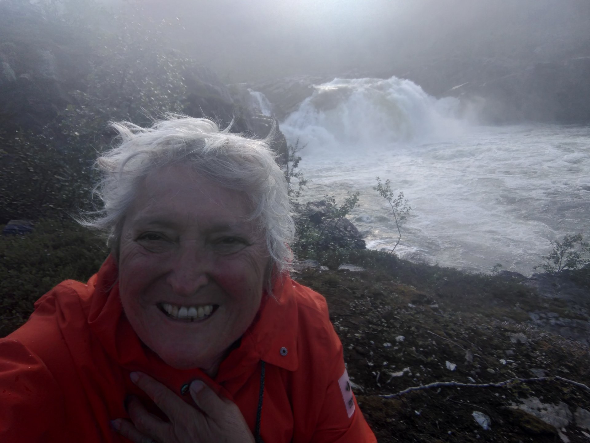 Die haben wir auch auf dem nächsten Übernachtungsplatz. Wir stehen direkt am Sjonfoss. Morgen überqueren wir per Schiff den Polarzirkel.