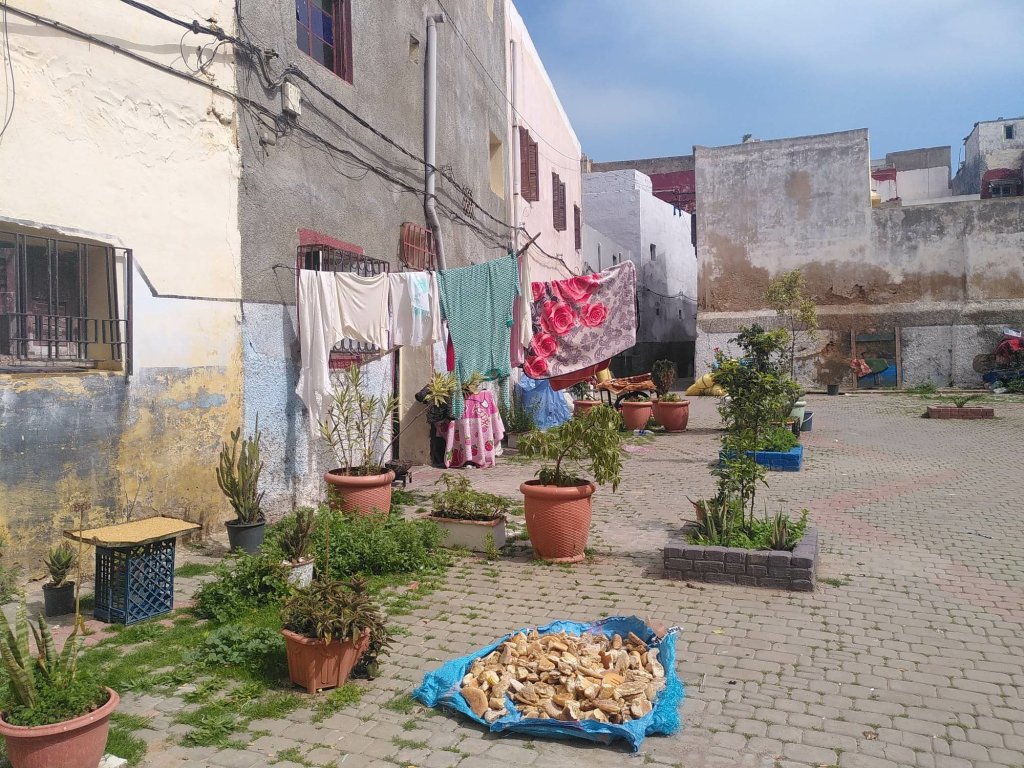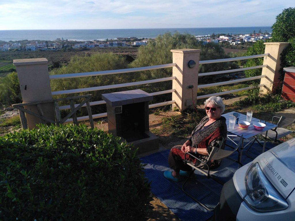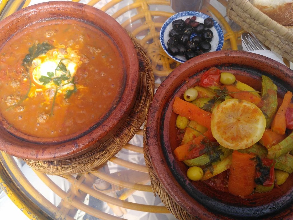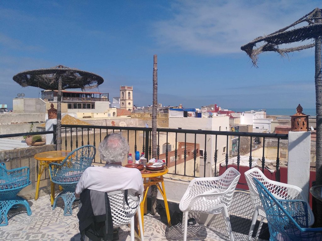 Am Abend kommt Ali mit den vormittags bestellten Hühnchen-Gemüse-Tajines vorbei. Seine Frau kocht, er kümmert sich um Aquise und Lieferung. Er spricht fließend Deutsch und Französisch (was nicht mehr alle MarokkanerInnen tun, obwohl Französisch noch eine der Amtssprachen ist) und hat eine unaufdringliche Art, seine Produkte zu bewerben. Ich glaube, er und seine Frau betreiben ihr Geschäft sehr gut. Unser Abendessen ist köstlich, wir sitzen draußen und sehen einmal mehr der Sonne beim Untergehen zu.