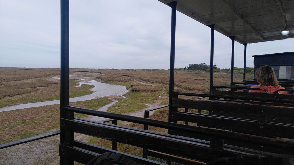 Wir laufen zwei Stunden durch diese unter Naturschutz gestellte Landschaft, die Sonne scheint, die Störche fliegen über uns hinweg oder klappern in ihren Nestern.