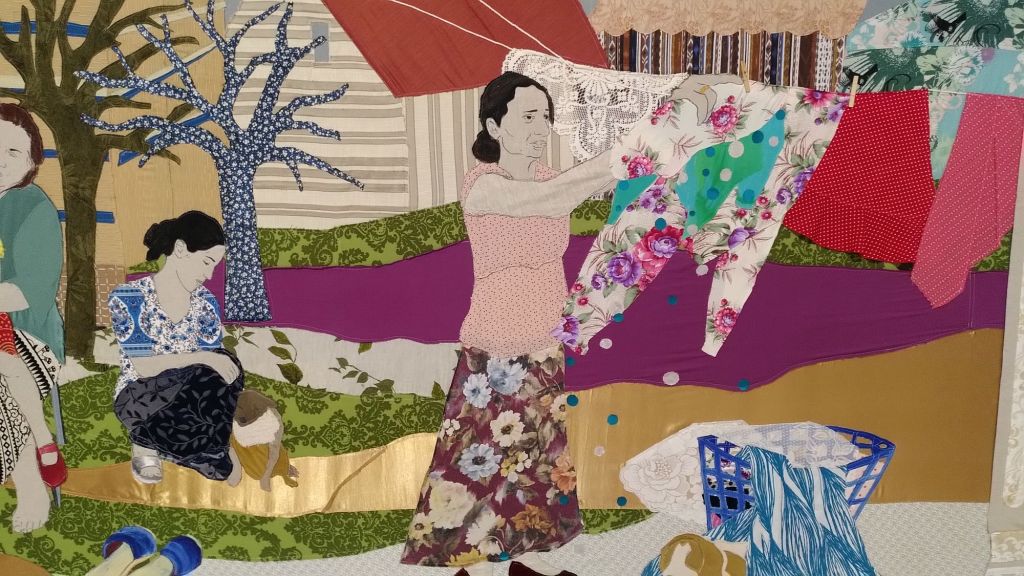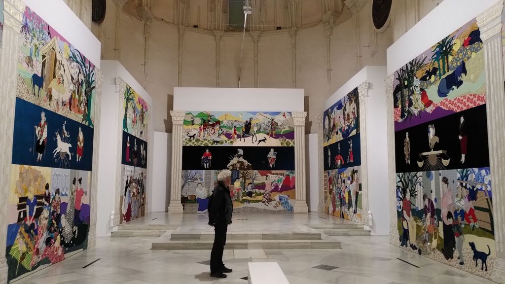 Wir schauen und staunen. Riesige Tapisserien der polnischen Künstlerin Małgorzata Mirga-Tas kleiden das Kirchenschiff aus. Sie waren vor zwei Jahren Polens Beitrag zur Biennale in Venedig. Zum ersten Mal stellt die polnische Künstlerin in Spanien die beeindruckende Serie von Wandteppichen aus, in denen sie das Leben der Frauen ihrer Gemeinde zusammen mit anderen Geschichten der Roma in Sevilla nachbildet.