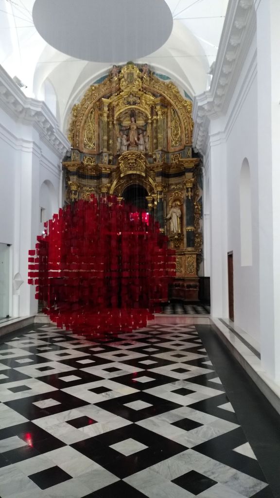 Den krönenden, besser leuchtenden Abschluss unseres Besuches erleben wir mit der Installation „Rote Sphäre“ des Argentiniers Julio le Parc vor einem weiteren Hochaltar. Fast 2000 durchsichtige Kunststoffplättchen verarbeitete er zu einer leuchtenden, sich in sich bewegenden Kugel,