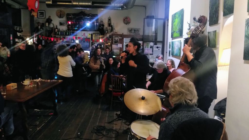 Ziemlich geflasht von so viel unerwarteter interessanter Kunst suchen und finden wir eine Kneipe, in der nicht nur wir ein Bier trinken, sondern abwechselnd drei gute Sängerinnen, die sich scheinbar spontan aus dem Publikum melden, spanische Lieder, leicht verjazzt, singen. Begleitet werden sie von einer kleinen Drei-Mann-Band.