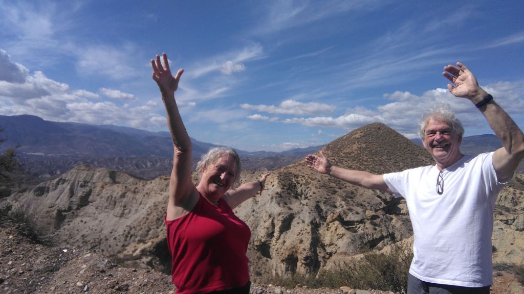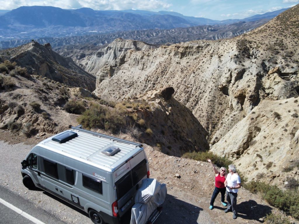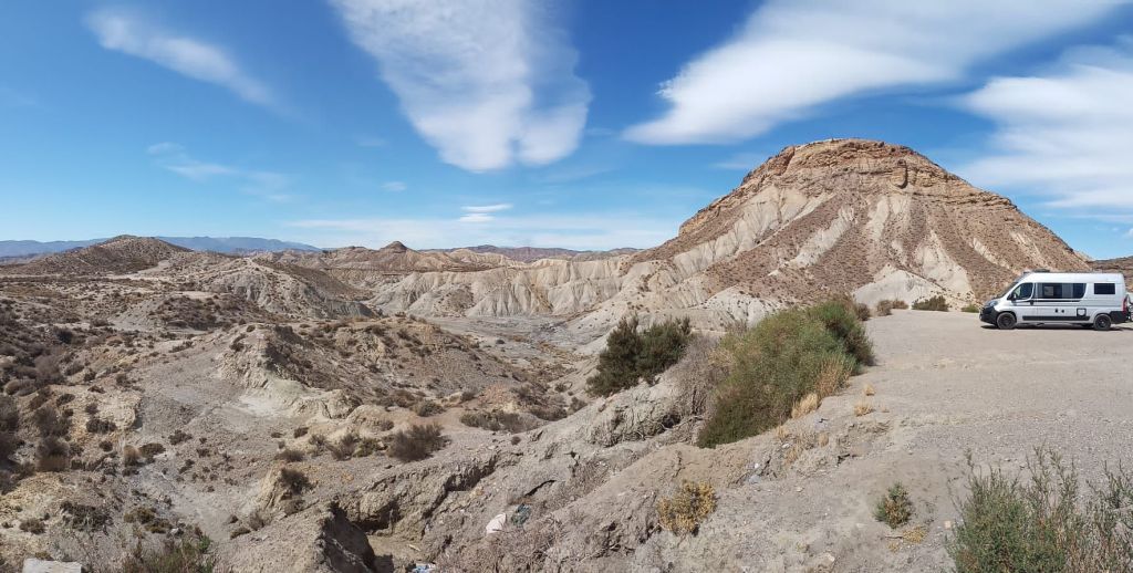 Okay, kann ja nicht immer alles glatt laufen, jetzt auf in die Wüste! Gorafe ist der Name. Wenn man ins Internet schaut, was wir natürlich gemacht haben, findet man begeisterte Beschreibungen: „Die Wüste von Gorafe in der Provinz Granada in Andalusien ist wie von einem anderen Planeten. Das durch vielfältige Formen und Farben geprägte Gebiet besitzt eine einzigartige Schönheit, deren Landschaft an Kappadokien erinnert.“