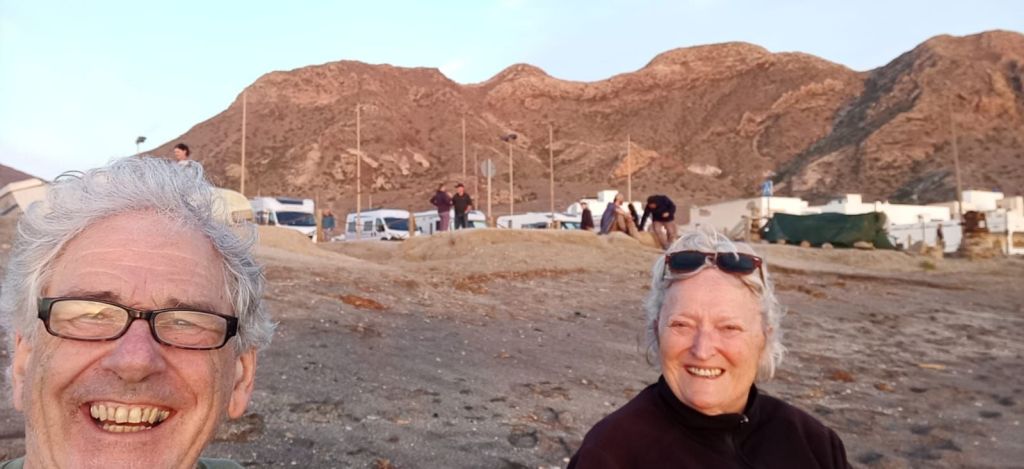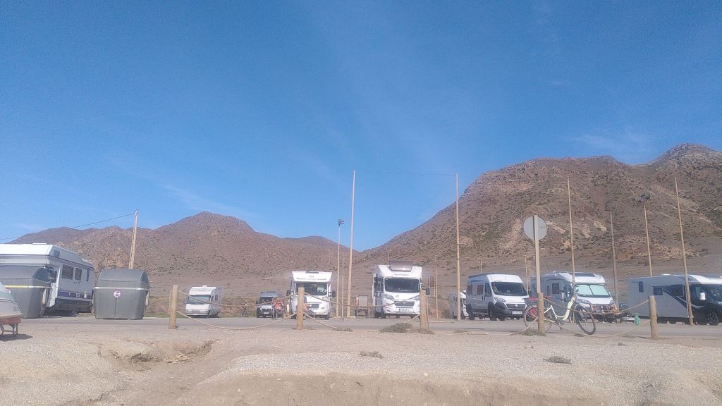 Wir sind in der kleinen Siedlung La Fabriquilla beim Cabo de Gata, die um diese Jahreszeit unbewohnt ist. Hier gibt es wohl nur Ferienhäuser. Für uns ein Glück, weil die Ansammlung von Wohnmobilen so niemanden stört.
