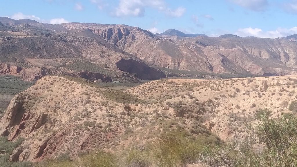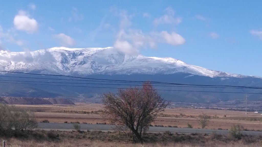 Wir verlassen das schöne Guadix, fahren vorbei an den schneebedeckten Bergen der Sierra Nevada, wechseln von der Provinz Granada in die Provinz Almería und fahren von 900 hinunter auf 400 Höhenmeter in Tabernas.