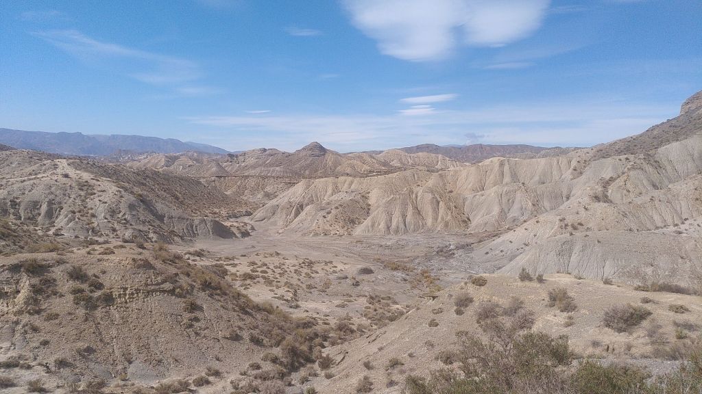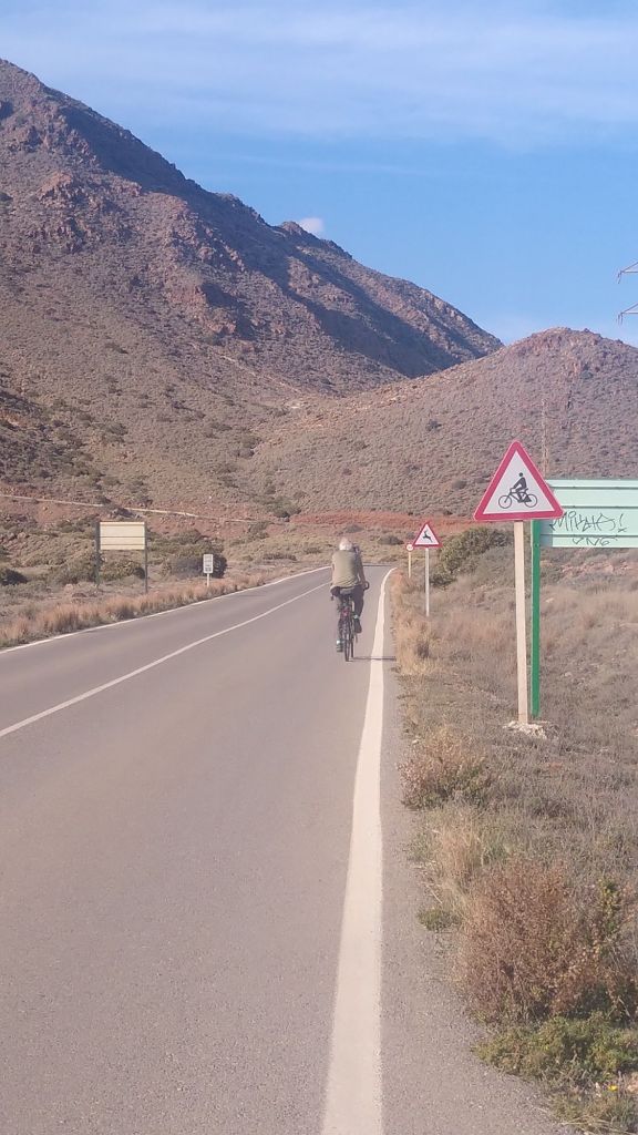 Dann empfängt uns eine spektakuläre Landschaft mit Sonnenschein und 20 Grad! Wir haben die (Halb-)wüste von Tabernas erreicht.