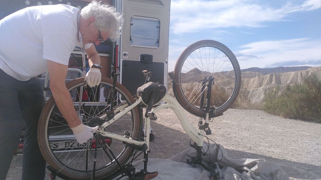 Erstmal Kaffee kochen und die Aussicht genießen. Dann packen wir die Fahrräder vom Bus, um ein bisschen durch die Gegend zu fahren. Mist! Mein Rad hat einen Platten – und ich zum Glück einen Mann, der sehr versiert darin ist, kaputte Reifen zu reparieren.
